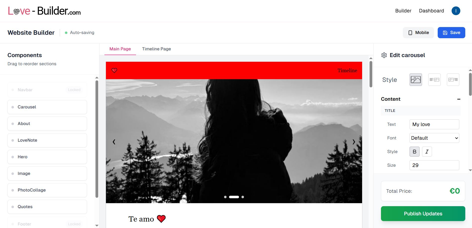 Use the website builder to customize your love website with ease. Add components, reorder sections, upload photos... Make it truly yours.